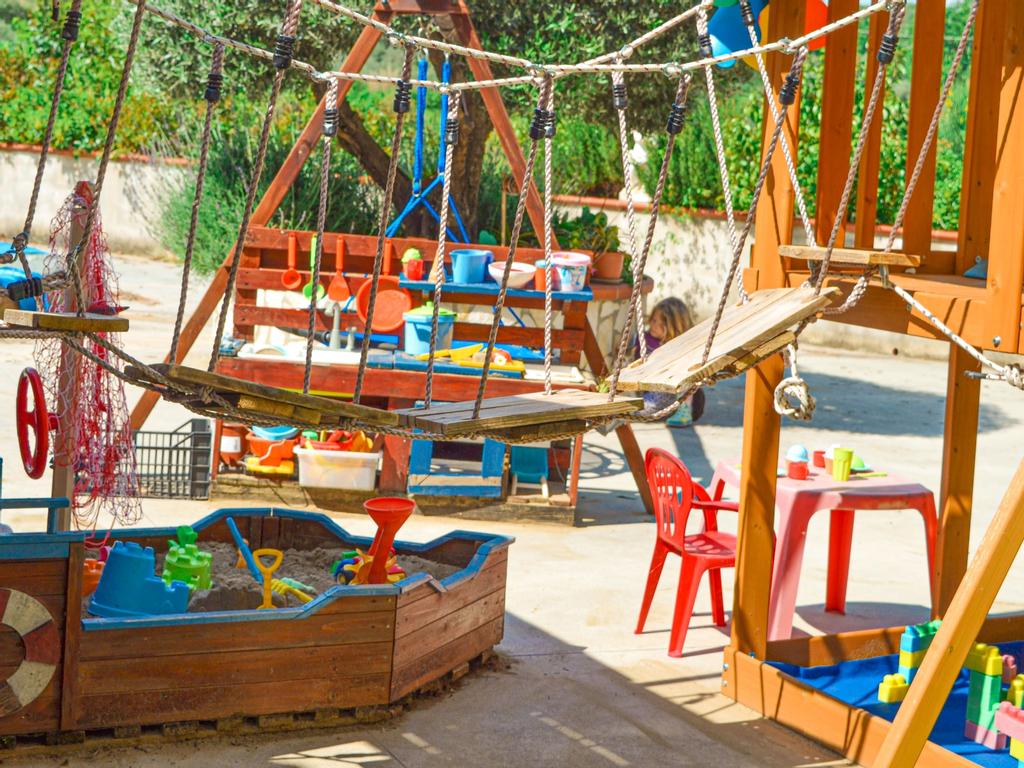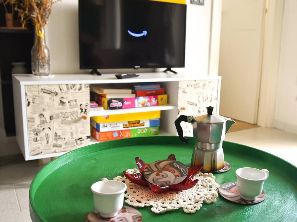 The hill on which the house is located offers a complete panorama, in front of the apartment you can see the complete plain of the soul of Paestum above the blue Mediterranean Sea and the Gulf of Salerno with the famous Amalfi Coast in the background. Sitting on the terrace of our apartment, you can see the mountains of Trentinara and Giungano on one side and on the other side the rolling olive groves complete the typical image of southern Italy. Our holiday apartment is called Rigoletto because we have decorated it with paintings by a local artist on the theme of the opera of the same name by Giuseppe Verdi. Thus, typical crafts such as lace doilies, handmade pottery or traditional objects can be found between the modern furnishing style of the vacation apartment. We have been inspired by our own travels and allow our guests to spend a unique and unforgettable stay in Cilento. We offer programs in different languages on Prime Video. When you first enter the living room you will notice the sofa, which can be pulled out and could serve as a third bed. There is a small selection of books in different languages. The kitchen is equipped with a small oven, a fridge with freezer compartment, a four-burner gas cooker, a small dishwasher and everything you need. In addition to the usual moka for Italian espresso, there is a filter coffee machine. The owners provide oil, salt, dish soap, to the tenants. There is room for four people in the dining room and one can enjoy the view of the mountain village of Trentinara, whose lights stretch in the evening over the mountain range like a snake. There is a small hallway between the kitchen and the bedroom. There is a cabinet with a large mirror that allows for a head-to-toe view. There is enough space for jackets, handbags and shoes. The bathroom has a large shower, sink and toilet. There is a hair dryer here. The large bathroom window opens onto the garden. The large roof terrace with a panoramic view is particularly beautiful. You can see the sea, but also the mountains and the olive groves. For tenants there are two deck chairs and a table with two chairs. It is also possible to put the laundry here to dry it. The roof terrace is shared, while the garden and the terrace in front of the apartment are private. During the summer months, the neighbors' playground with a slide, swings, playhouse and sandbox can be used. There is also a communal swimming pool to cool off in the summer. There is a parking space for your car on the property